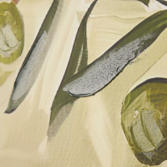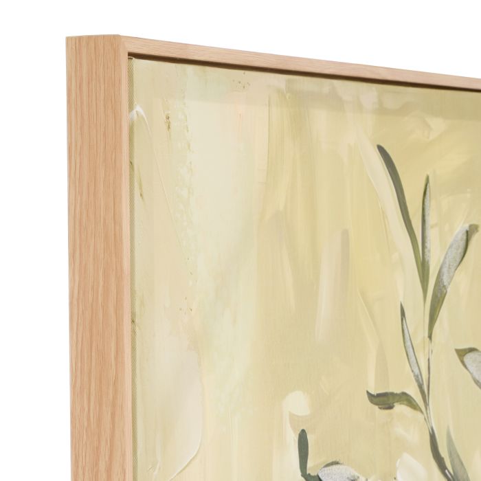 This Cecil Hand Painted Wall Art features a hand-painted soothing still life of an olive branch in a jar and ripe oranges, encased in a plastic frame.