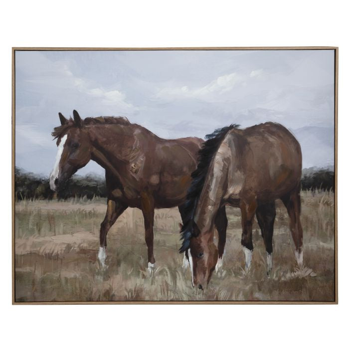 This Chestnut Hand Painted Wall Art features a hand-painted countryside scene of two charming brown horses grazing encased in a wooden frame.