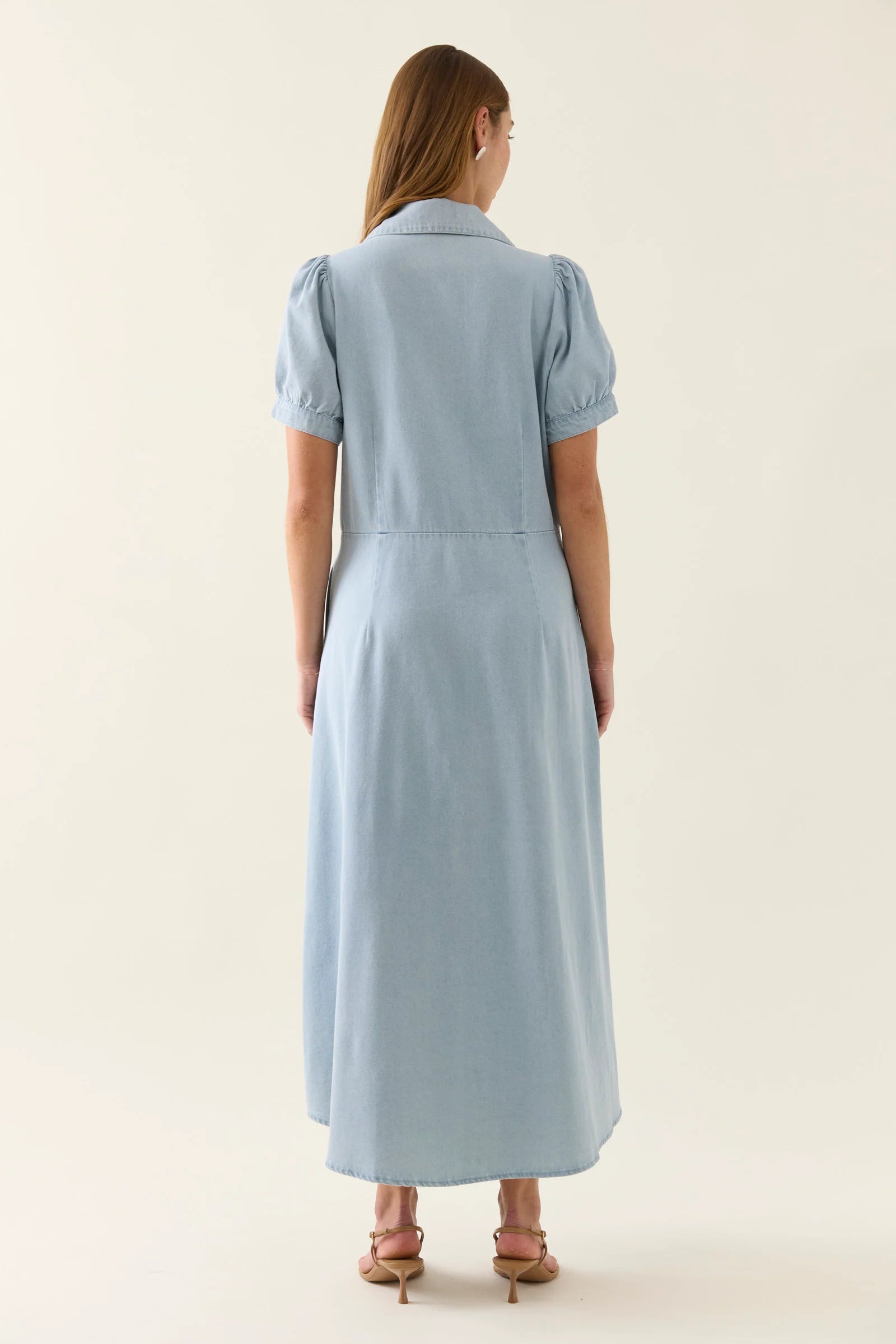 Designed in a breathable cotton denim, in two beautiful washes, the Sofie Denim Maxi is a button-through empire line dress with gathered bust detailing, fixed puff sleeves, and side seam pockets. Its 7/8 length and soft structure make it endlessly wearable.