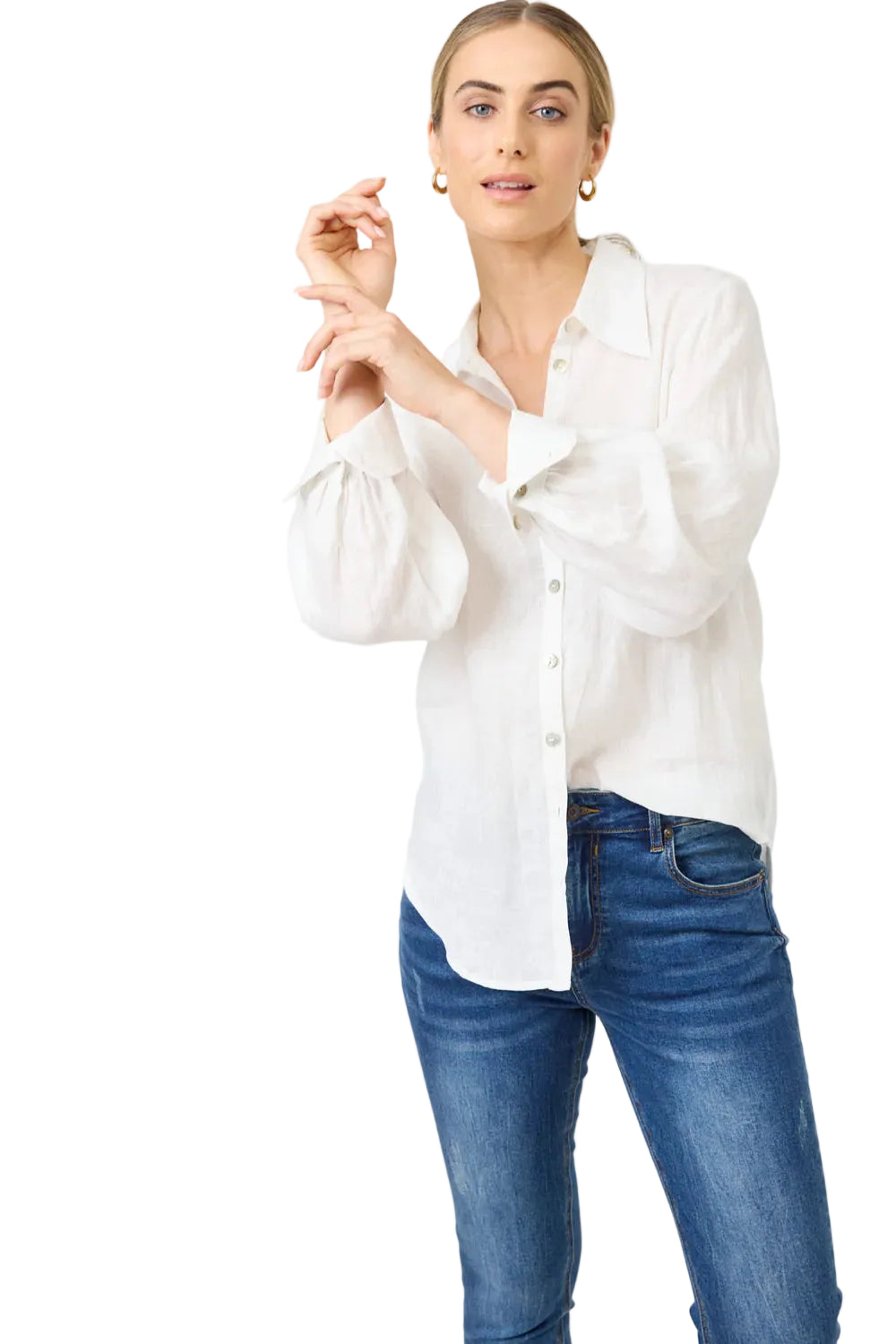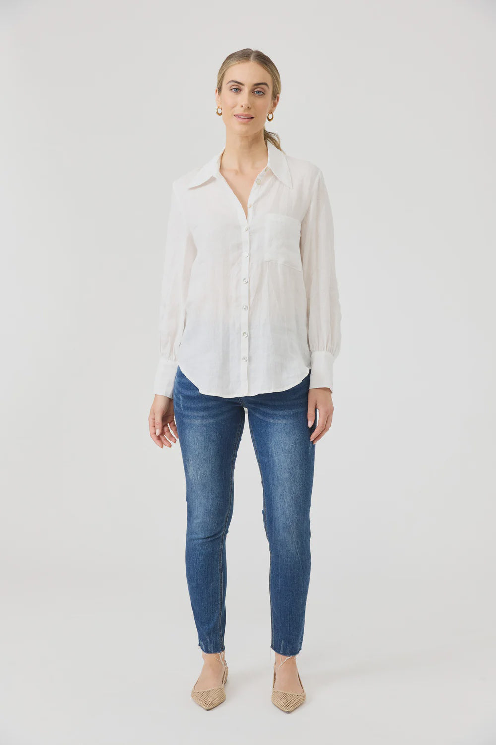 A smart, versatile staple for work or weekend. Crafted from 100% linen for breathability and natural texture. Designed with a collar, button-through front, and a softly curved high-low hem. Features a slightly fitted silhouette and longer cuffs with a three-button closure for added detail. True to size fit for easy layering.