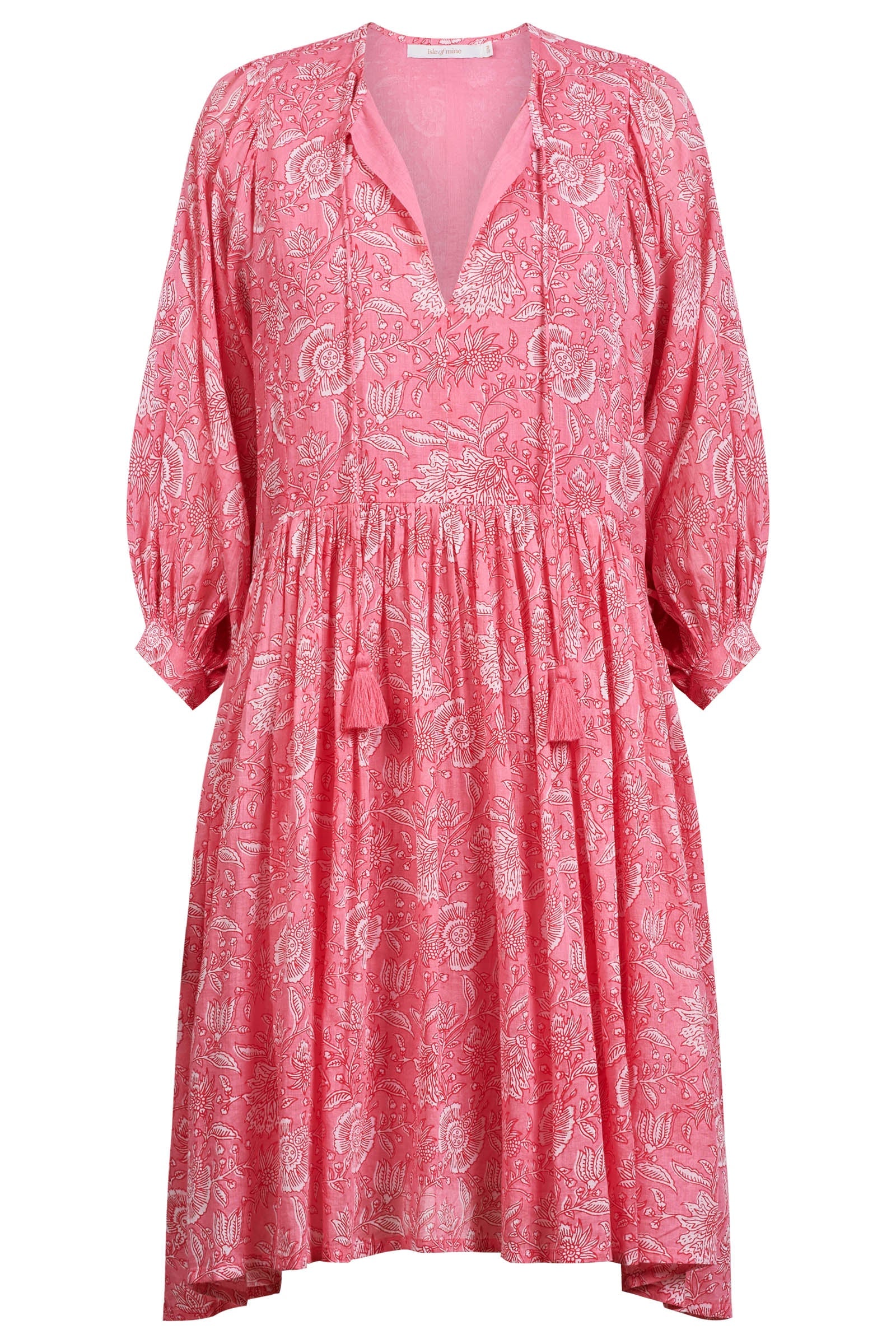 The Wilma Dress is crafted from lightweight cotton voile, hand screen printed for a one-of-a-kind look. Inspired by floral hand-block, and featuring a V-neckline with tassel ties, a gathered waist, 3/4 sleeves. Fully lined for comfort and ready to wear. Throw on with sandals for a walk by the beach or dress up with earrings and wedges for an afternoon in the sun.