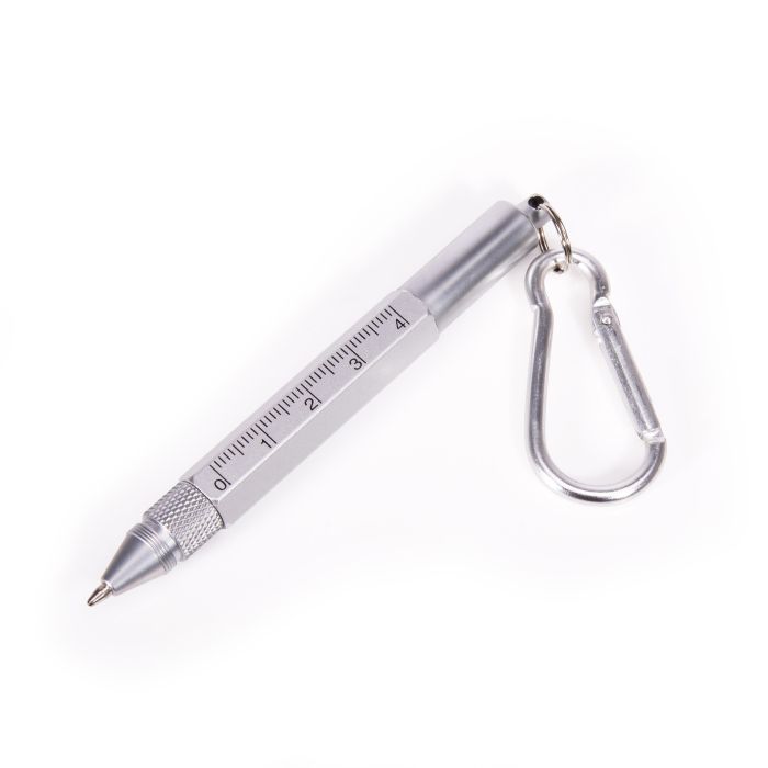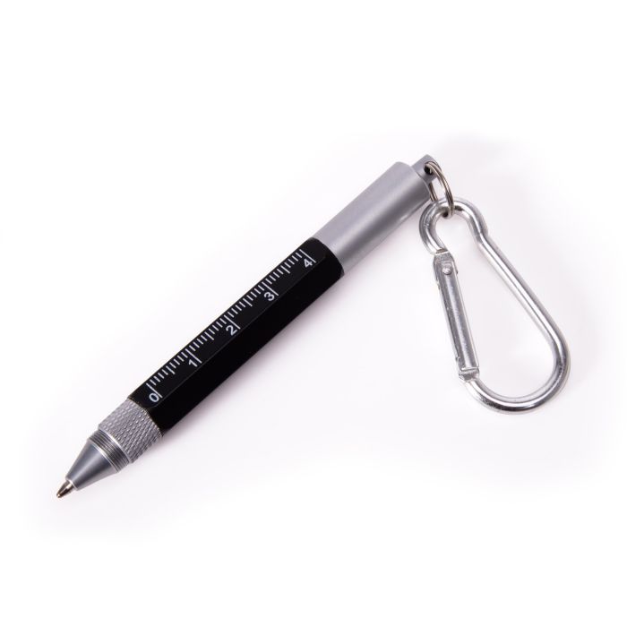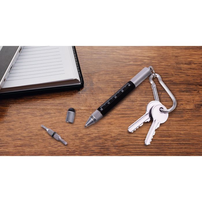 Includes: black ink ballpoint pen, spirit level, Philips head screwdriver, flat-head screwdriver and stylus ruler.