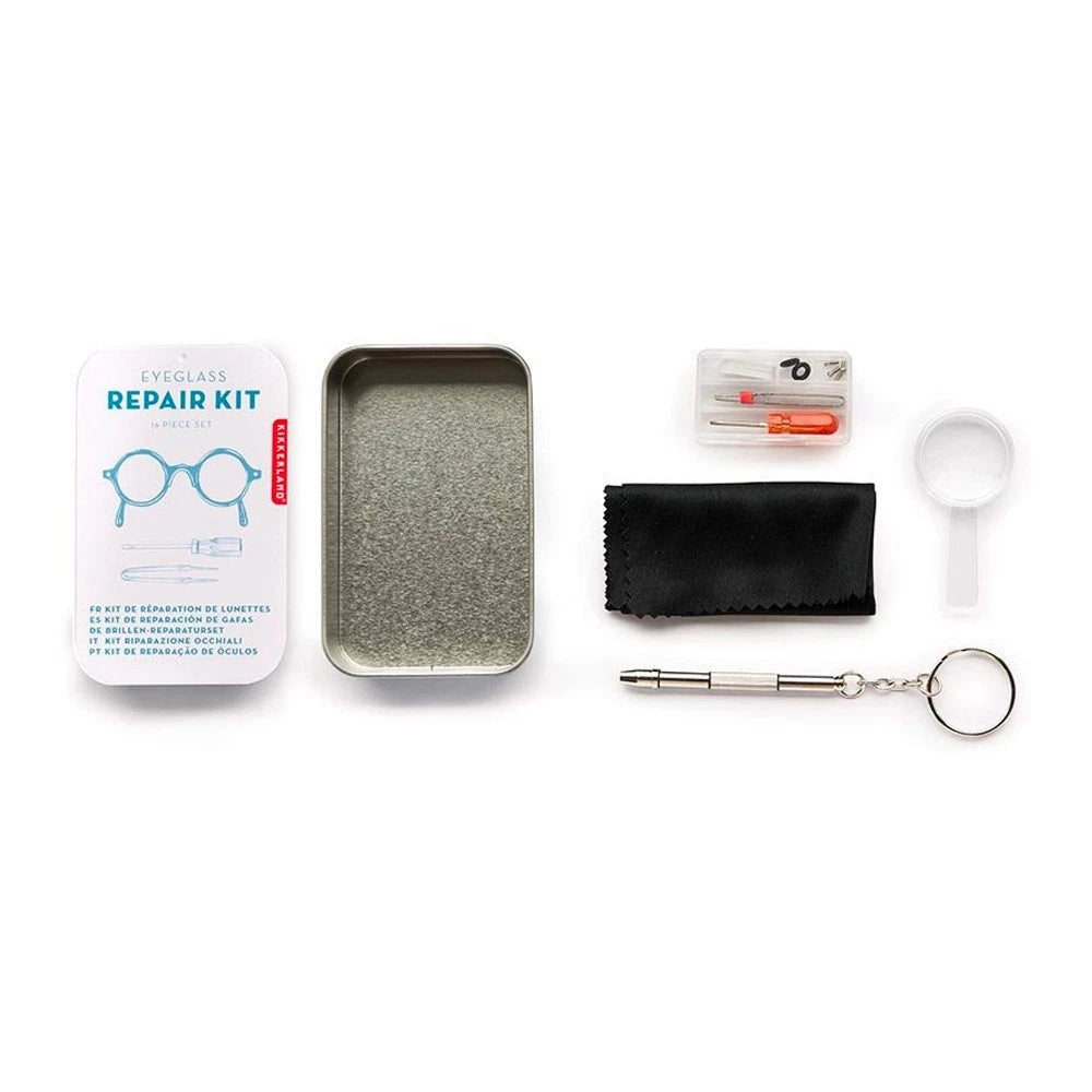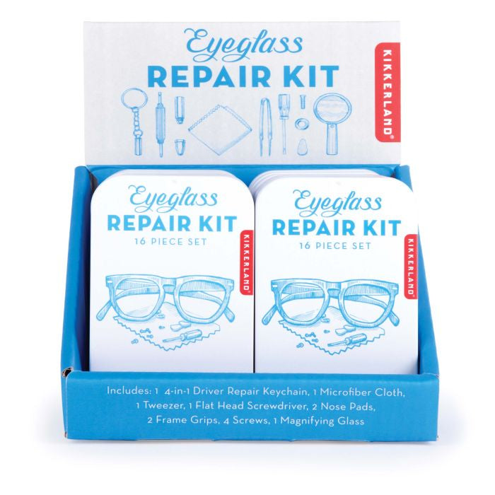 This handy tin kit features everything you need for a quick eyeglass repair.