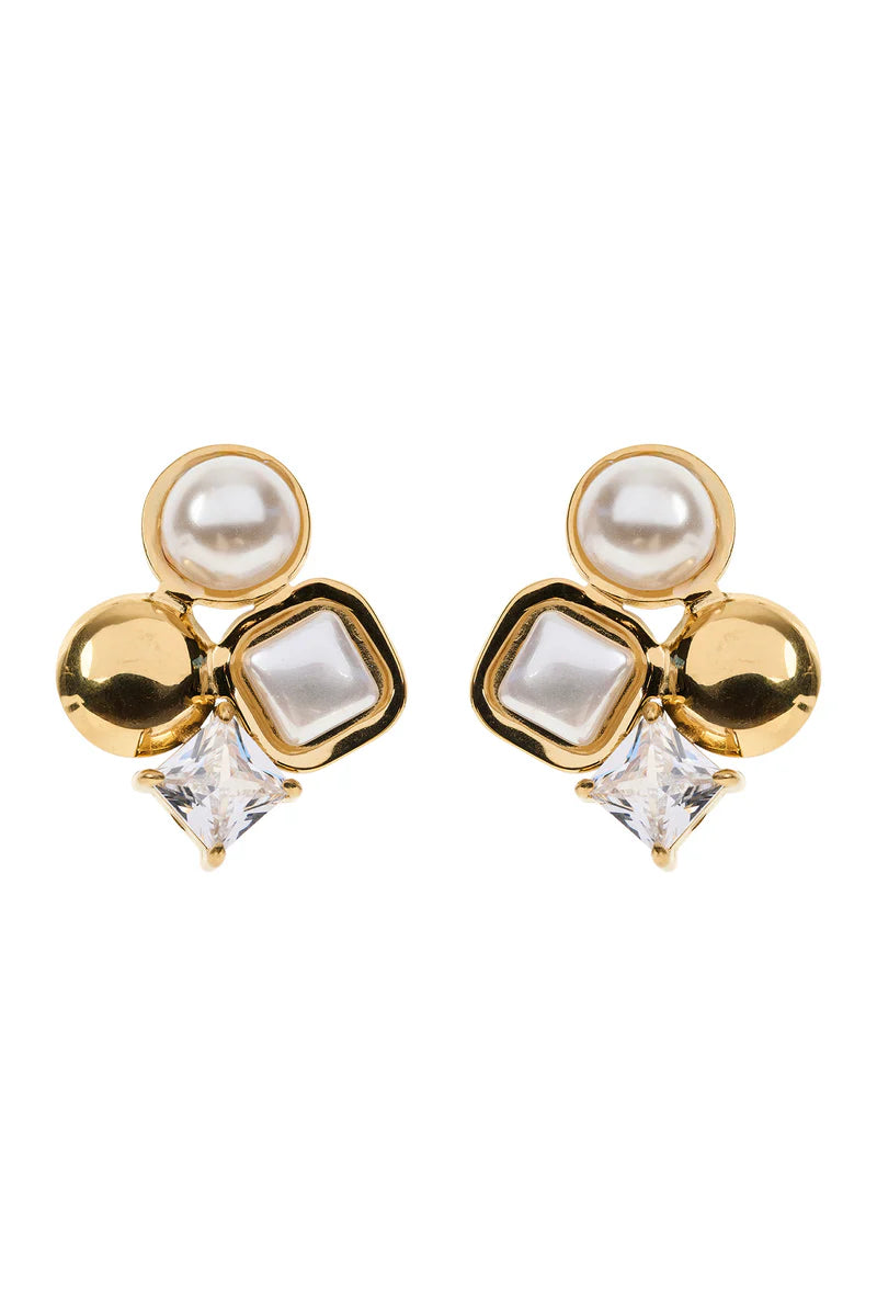 A refined stud earring collection featuring pearl and diamante accents. Designed as an easy statement for everyday wear.