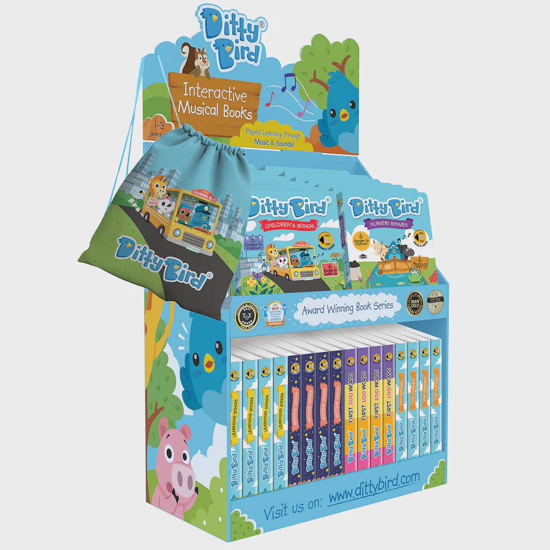 Includes: 4x Nursery Rhymes, 4x Children's Songs, 4x Learning Songs, 4x Bedtime Songs, 4x Animal Songs, 4x Action Songs, 4x First 100 Words, 4x Sounds of Australia, 4x Fun Alphabet, 4x Music To Dance To, 8x Ditty Bird Backpacks, 1x Ditty Bird Counter Display