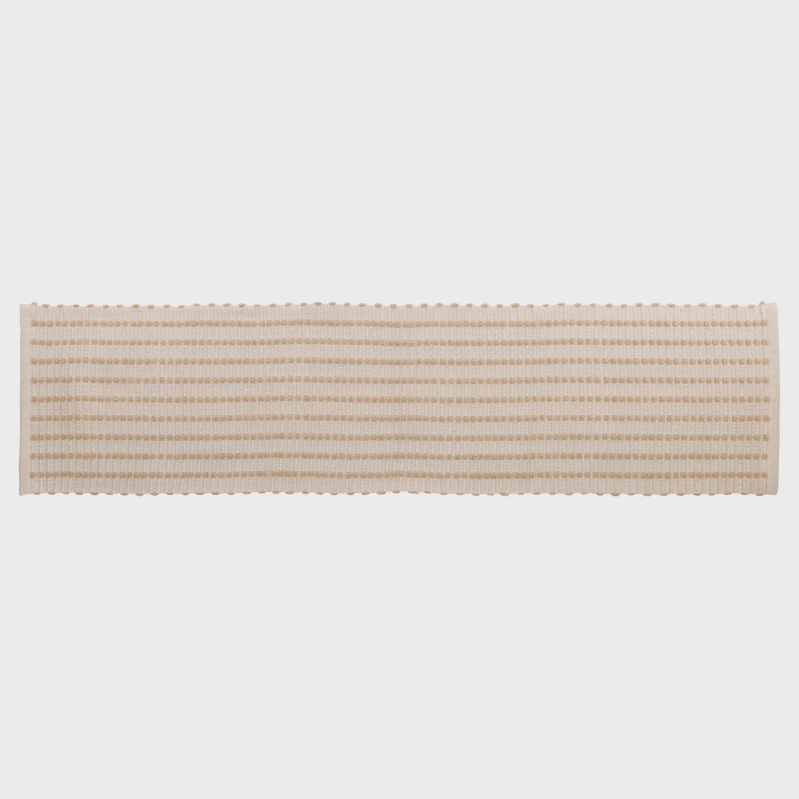 Featuring a natural blend of oat and tan, it boasts a woven design with scalloped edges for added detail.